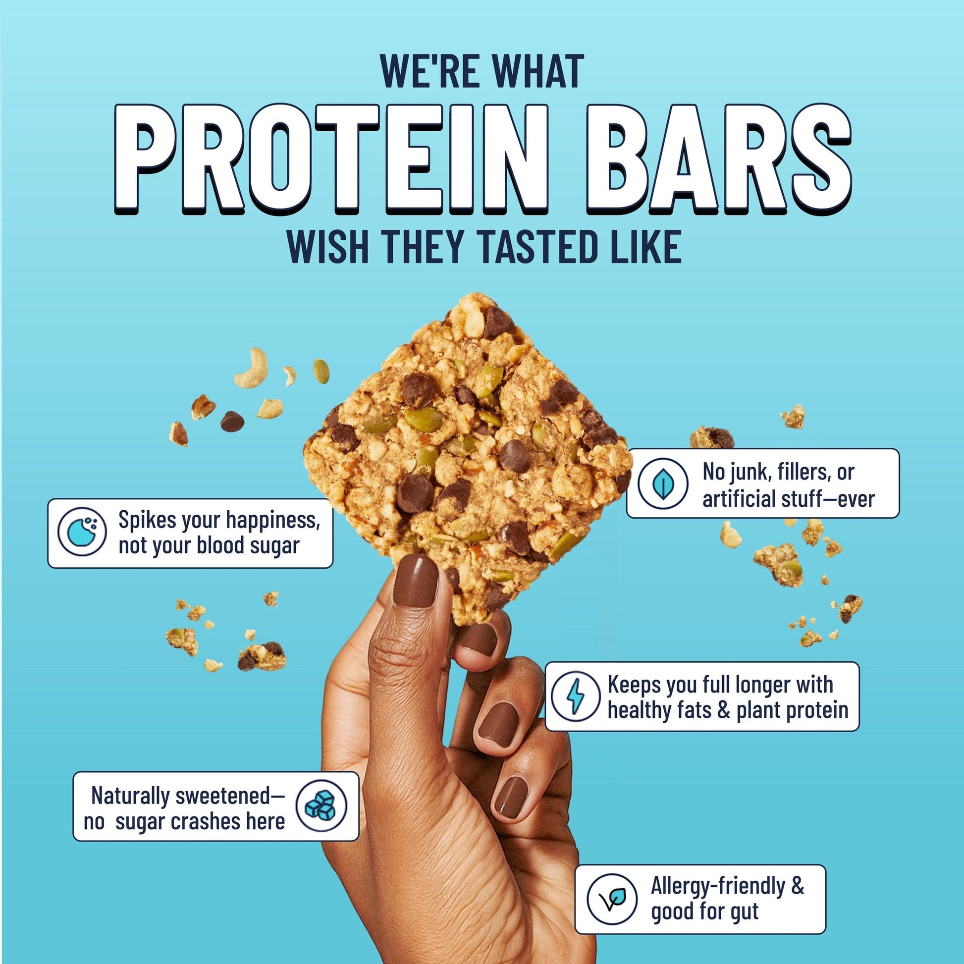 OUR BEST SELLER! Enjoy the decadent taste of a chocolate chip cookie in a better-for-you bar format. Made with plant-based ingredients like almonds, maple syrup, dark chocolate, and fresh Saigon cinnamon, this flavor is truly a guilt-free treat. Its crunchy, chewy, nutty, decadent, plant-based goodness.